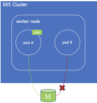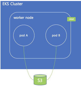 지난 포스트에서 쿠버네티스 노드에 IAM을 부여할 경우 (해당 노드에) 배포되어 있는 모든 파드가 동일한 권한을 갖게 되며 이는 보안상 적절하지 않다고 얘기했습니다. (그림으로 표현하자면 아래와 같을 겁니다.)