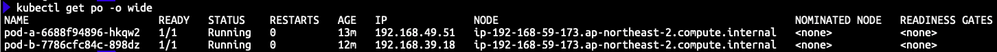 apiVersion: apps/v1 kind: Deployment metadata: name: pod-b spec: replicas: 1 selector: matchLabels: app: pod-b template: metadata: labels: app: pod-b spec: containers: - name: ubuntu image: ubuntu:latest imagePullPolicy: Always command: [ "/bin/bash", "-c", "--" ] args: [ "while true; do sleep 30; done;" ] nodeSelector: kubernetes.io/hostname: ip-192-168-59-173.ap-northeast-2.compute.internal(배포는 생략)